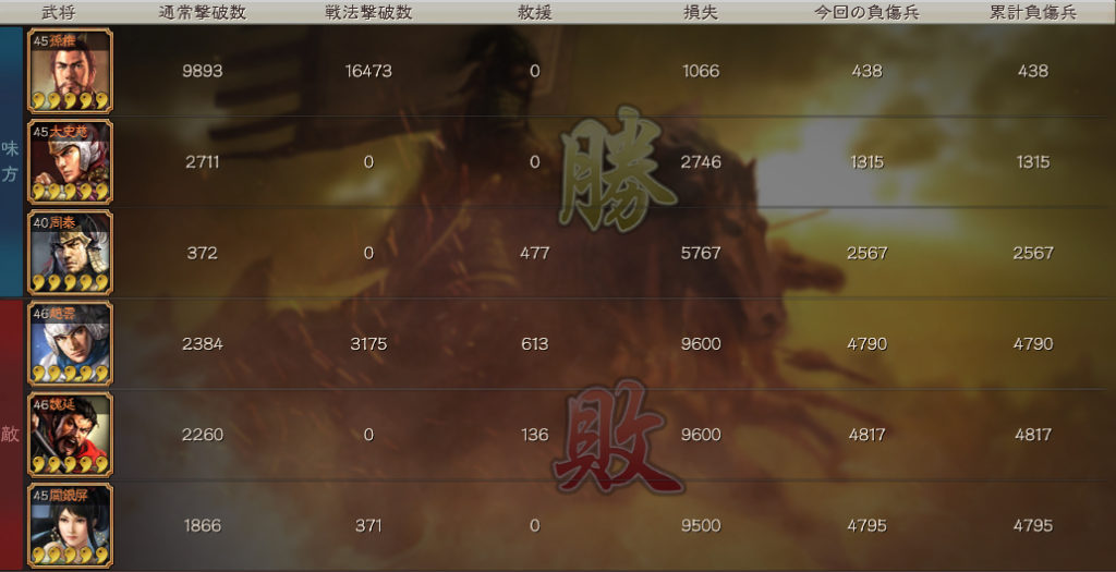■孫権 鬼神霆威の代わりに一騎当千でもダメージがでますが、鬼神霆威の方が壊滅させる確率が高いので、負けた場合相手を一人でも壊滅させてる方が良いので鬼神霆威の方が役に立ちます。